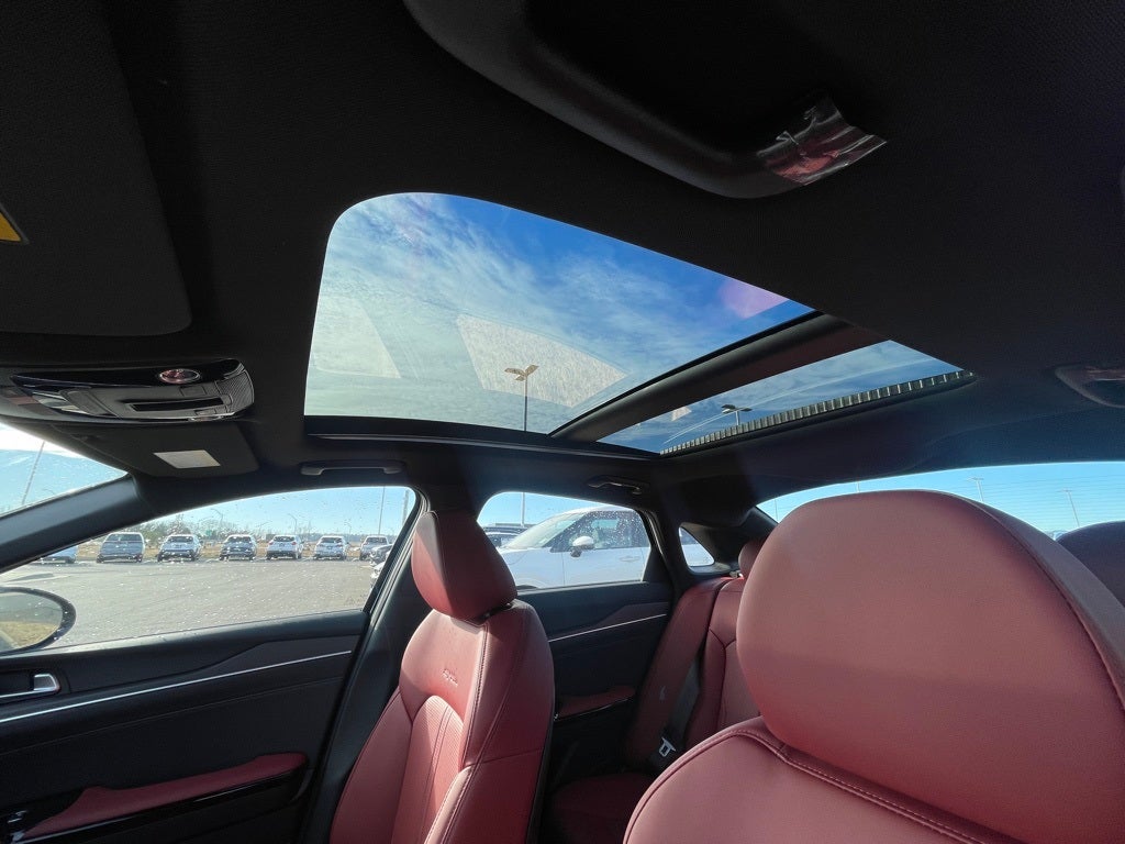 K5 GT-Line, 4D Sedan, 8-Speed Automatic, 4-Wheel Disc Brakes, 6 Speakers, ABS brakes, Air Conditioning, Alloy wheels, AM/FM radio: SiriusXM, Auto High-beam Headlights, Automatic temperature control, Brake assist, Bumpers: body-color, Delay-off headlights, Driver door bin, Driver vanity mirror, Dual front impact airbags, Dual front side impact airbags, Electronic Stability Control, Emergency communication system: Kia Connect (includes 1 year free trial), Four wheel independent suspension, Front anti-roll bar, Front Bucket Seats, Front Center Armrest, Front dual zone A/C, Front fog lights, Front reading lights, Fully automatic headlights, Heated door mirrors, Heated Front Bucket Seats, Heated front seats, Heated steering wheel, Illuminated entry, Knee airbag, Leather Shift Knob, Leather steering wheel, Low tire pressure warning, Navigation System, Occupant sensing airbag, Outside temperature display, Overhead airbag, Overhead console, Panic alarm, Passenger door bin, Passenger vanity mirror, Power door mirrors, Power driver seat, Power steering, Power windows, Radio data system, Radio: AM/FM Audio System, Rear anti-roll bar, Rear seat center armrest, Rear side impact airbag, Rear window defroster, Remote keyless entry, Security system, Speed control, Speed-sensing steering, Split folding rear seat, Sport steering wheel, Steering wheel mounted audio controls, Tachometer, Telescoping steering wheel, Tilt steering wheel, Traction control, Trip computer, Turn signal indicator mirrors, Variably intermittent wipers, Wheels: 18 x 7.5J Gloss Black Machined Finish Alloy, K5 GT-Line, 4D Sedan, 8-Speed Automatic.